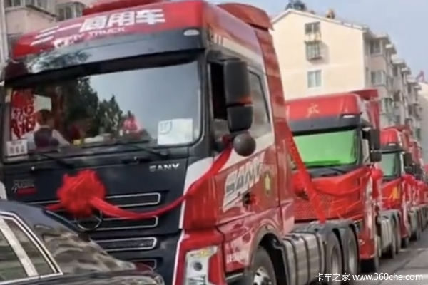 只见一辆豪华轿车后面有9辆红色的半挂牵引车排成一列,半挂牵引车上都挂着喜结。视频传到网上以后,网友们都直呼“大场面”“好气派”“恭喜祝贺”“喜结连理”。