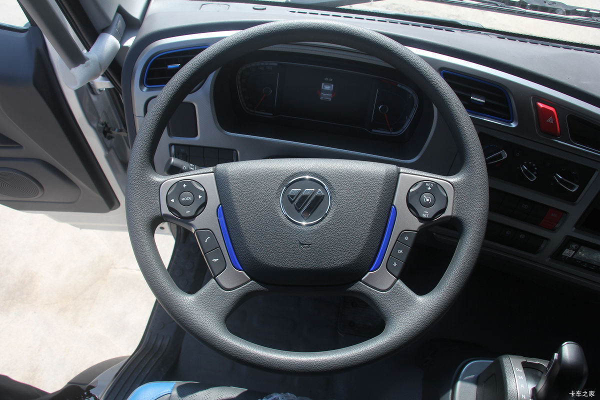 驾驶室采用的是高顶双卧驾驶室,空间表现优秀,司机在里面基本上可以做到行走自如。实拍车驾驶室的配色以黑色与浅灰为主,深浅搭配适宜。方向盘采用四幅式设计,多添一份运动感,手感与操控感都不错。而且方向盘上还设置有多媒体、定速巡航等按键。