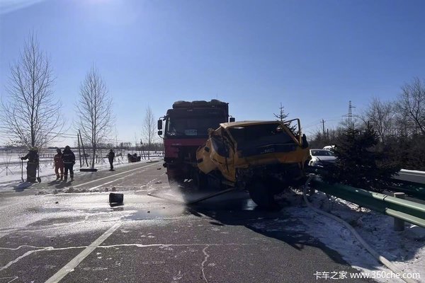 2月14日,黑龙江省鹤岗市一条双向四车道的公路上发车车祸,网传视频显示,路中间的隔离护栏被撞倒地,一辆红色的自卸车致一黄色车辆严重受损,隔离带内和路面上均有身穿橘黄色工服的人员躺在地上。