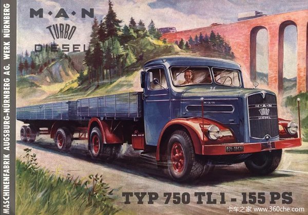 在二十世纪50-70年代,曼恩陆续推出了多款种类与型号各异的卡客车底盘。如下图的750 TL1-155 PS,车头后面牵引着长长的挂车,让运载效率大大提高。