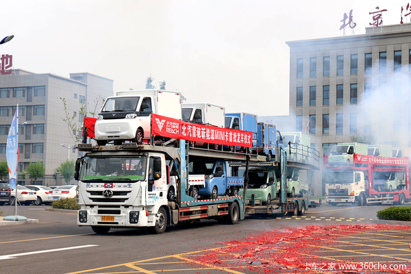 在喜悦的鞭炮声中,7辆满载63辆新能源MINI卡的货车稳稳驶出北汽雷驰厂区,发往北京、河北、山东、四川、新疆等市场。距离3月27日首车下线不到3个月时间,距离5月22日新品上市不足1个月,北汽雷驰新能源MINI卡迅速晋级“全国交付”模式,再次刷新“雷驰速度”,“领跑者”实力彰显无疑。