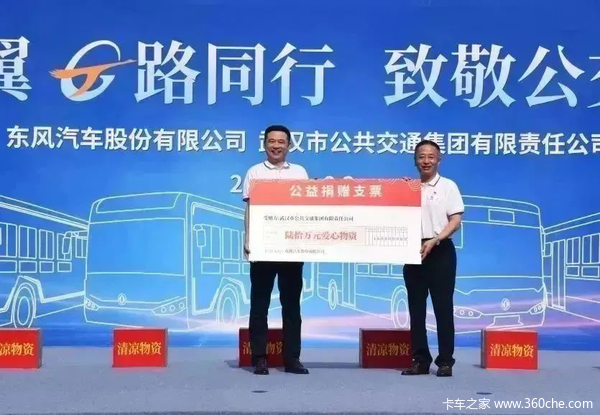 东风汽车股份向武汉公交集团现场捐赠价值60万元的清凉物资,六台东风天翼满载着物资奔赴武汉三镇为公交劳动者送去清凉,向奋战在一线的公交服务人员致敬。