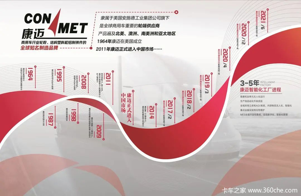 1964年,康迈在美国成立,发展至今已有近60年的轮端研发与应用经验,产品覆盖卡车、客车、挂车领域,产品遍及北美、澳洲、南美洲和亚太地区。2011年康迈正式进入中国市场,迄今为止康迈已为中国商用车行业提供了700多万套免维护轮端系统,深受国内各大主机厂及车桥厂的认可和信赖。