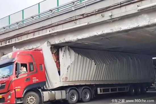 大货车在通过高速公路时限高,货车司机判断失误,开进桥下被卡住,司机冲动倒车又导致车厢被撕裂了,给轮胎放气,降了高度之后依然不能通过。