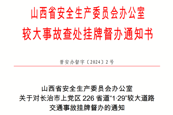 2月5日,据《国务院关于进一步加强企业安全生产工作的通知》《山西省较大事故查处挂牌督办办法》等有关规定要求,山西省安委办决定对该起事故查处实行挂牌督办。