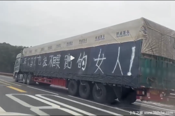 视频中是一辆在高速上飞驰的卡车,挂车左侧的硕大篷布上写着“再大马力也拉不回要跑的女人!”画面配上忧伤情歌,让人不免感慨,这是一个有故事的人。