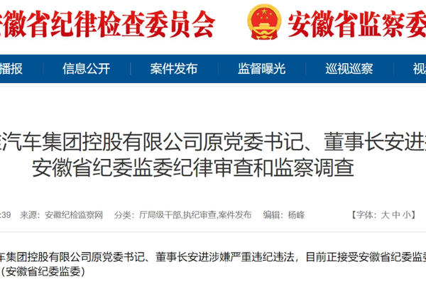 安徽江淮汽车集团控股有限公司原党委书记、董事长安进涉嫌严重违纪违法,目前正接受安徽省纪委监委纪律审查和监察调查。
