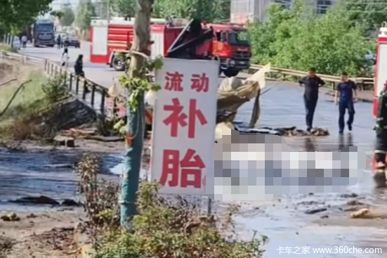 在泰安市泰山区化马湾乡洪河村口,一辆大罐车突发爆炸,造成罐内的液体向外泄漏,不断散发出刺鼻的味道,土地被染成了红色。