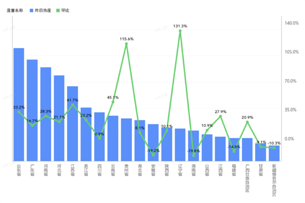与昨日相比,辽宁环比涨幅度最快,达到131.3%,其次为贵州,环比涨幅为115.6%。湖南与安徽降幅最大,分别为-19.8%与-19.2%。(数据来源:卡车之家)