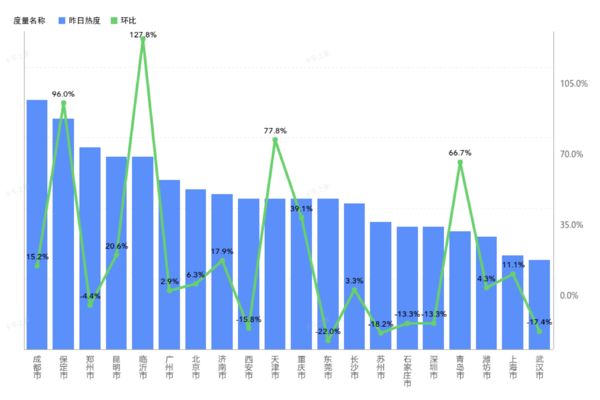 从图中可以看出,临沂市环比涨幅最大,达到127.8%,紧接着是保定市与天津市,环比涨幅分别是96.0%与77.8%。东莞市跌幅最大,为-22.0%,其次是苏州市,为-18.2%。(数据来源:卡车之家)