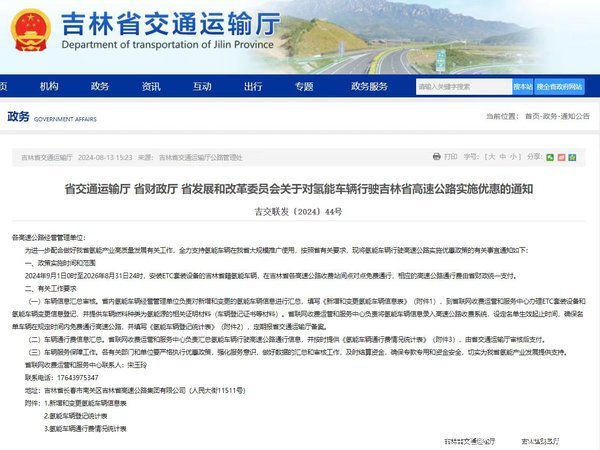 8月12日,吉林省交通运输厅官网发布省交通运输厅 省财政厅 省发展和改革委员会关于对氢能车辆行驶吉林省高速公路实施优惠的通知。