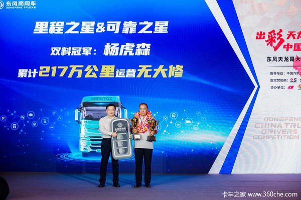 2024年9月26日,东风商用车天龙哥大赛(第7季)颁奖典礼在武汉隆重举行,现场共颁发节油之星、节气之星、里程之星、人气之星、出勤之星、养护之星、可靠之星七大奖项,共13人获奖,每人获赠5万元奖金,最大的惊喜则来自甘肃张掖前进牧业的杨虎森卡友,以217万公里运营无大修摘得本季里程之星和可靠之星,成为本季天龙哥大赛唯一的双料冠军,摘得东风商用车为本届赛季准备的价值近60万的冠军奖车——东风商用车高端车型东风天龙GX燃气车。