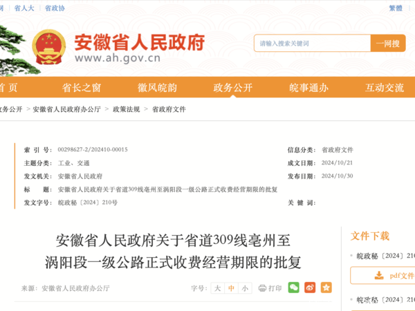 近日,安徽省人民政府官网公开一则批复,同意省道309线亳州至涡阳段一级公路收费,期限为20年。