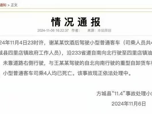 据河南南阳方城县“11.4”事故处理小组通报,4日23时许,谢某某饮酒后驾驶小型普通客车(司乘共4人,均为方城县四里店镇政府工作人员),沿233省道自南向北行驶至四里店镇油坊庄村路段时,未靠道路右侧行驶,与王某某驾驶的自北向南行驶的重型自卸货车相撞,小型普通客车司乘4人均已死亡。