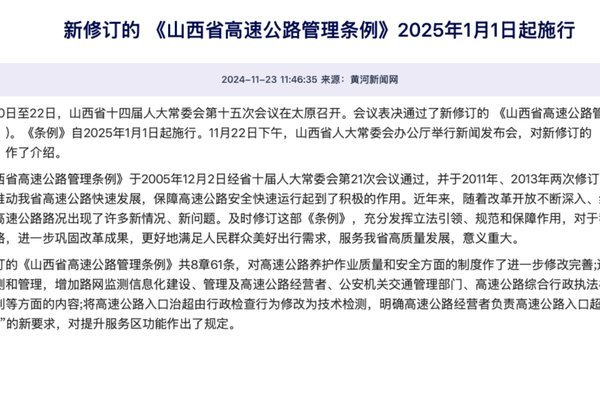 2025 年 1 月 1 日,新修订的《山西省高速公路管理条例》即将执行,新条例共 8 章 61 条,旨在完善养护作业质量与安全制度,规范路网运行监测管理,新增相关职责及协作机制内容,入口治超改为技术检测并明确经营者职责,还顺应 “交旅融合” 提升服务区功能。