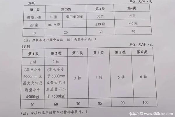 其公布的收费标准如下:两轴蓝绿牌20元/车·次,两轴黄牌60元/车·次,三轴货车70元/车·次,四轴车85元/车·次,五轴车90元/车·次,六轴车100元/车·次。