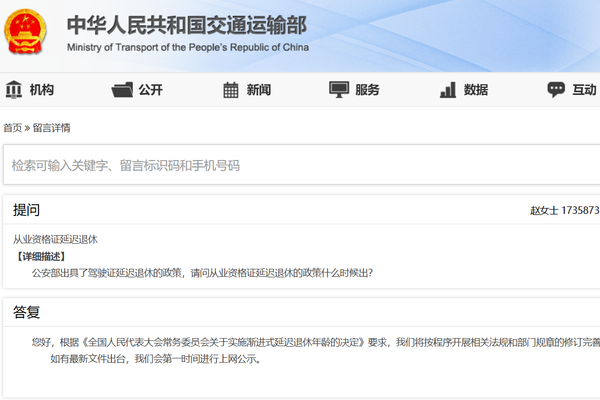 自2025年1月1日起,大中型客货车驾驶证的申请年龄和准驾年龄上限规定从60岁延长到了63岁,已被降级的也可以重新恢复。但现在的问题是,从业资格证的相关政策还没有同期延长,最近就有网友在交通运输部网站留言询问,得到的回复是: