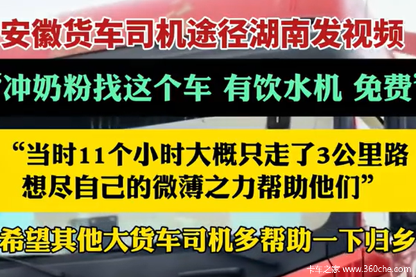 【卡车之家 原创】近日在湖北到长沙的高速上,出现了大堵车,11小时的时间,只走了三公里路。一位安徽籍卡友在看到这种情形后,主动在自己社交媒体上发布视频。如果大家有小孩需要冲奶粉,或者需要喝热水的,不用不好意思,可以随时来到他的车上找他,他车上的饮水机可以为有需要的人提供热水。