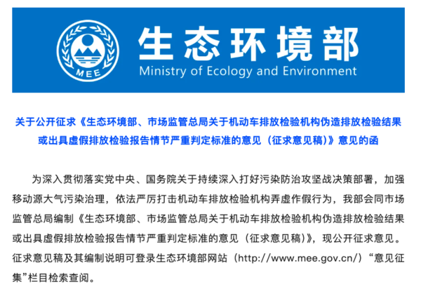 近日,生态环境部和市场监管总局正在公开征求关于机动车排放检验机构伪造排放检验结果或出具虚假排放检验报告情节严重判定标准的意见,截止时间为3月3日。