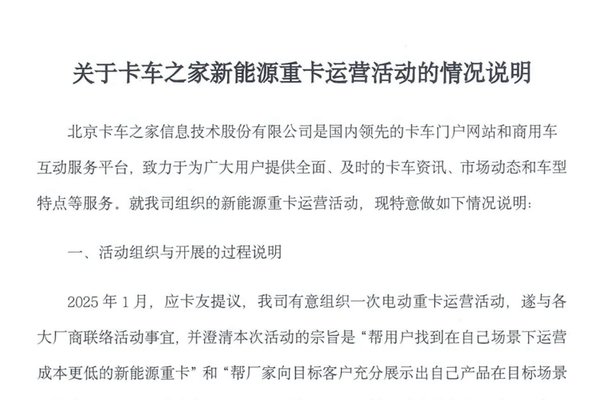 北京卡车之家信息技术股份有限公司是国内领先的卡车门户网站和商用车互动服务平台,致力于为广大用户提供全面、及时的卡车资讯、市场动态和车型特点等服务。就我司组织的新能源重卡运营活动,现特意做如下情况说明: