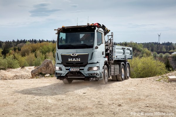TGS 35.540 8x2H-6 BL CH:展台上另一款起重车基于TGS四轴底盘打造,搭载540马力的D26发动机,并选配曼恩液压驱动(HydroDrive)-静液压前轮驱动系统,即使在松软地面上也能提供更好的牵引力。这款37吨的卡车适用于重载作业,配备一台大型帕尔菲格起重机,臂长95米,最大起重量为30吨,最大伸展长度可达22米。车辆前部区域额外设有20吨的起重机支撑装置。此外,可根据车身设计指南,重新安置紧急制动辅助系统的雷达传感器,确保传感器不会被前部支腿遮挡而无法正常使用。车辆配备宽敞的带卧榻TM驾驶室,为夜间行车提供充足的休息空间和舒适体验。