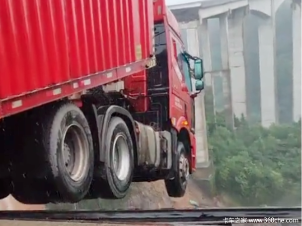 有视频显示,一红色货车车头已经腾空,车身还留在路面,货车司机尚待在车头。路上的人对司机喊“你命大啊危险啊!只能等消防来啊!没信号!”并称下方已经有两辆小车掉落。