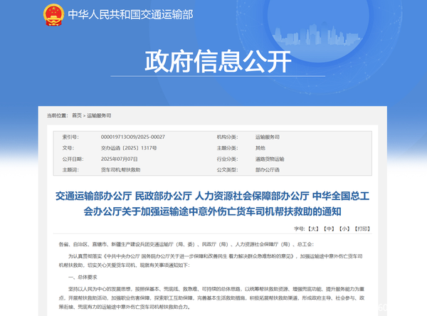 近日,交通运输部、民政部、人力资源社会保障部及中华全国总工会等四部门办公厅联合印发《关于加强运输途中意外伤亡货车司机帮扶救助的通知》,具体包括五项任务:提供医疗慰问援助、试点职工互助保险、推动职业伤害保险、纳入社会救助范围、开展关爱活动。