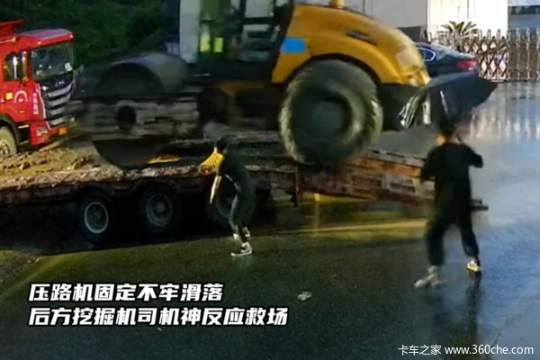 压路机固定不牢滑落,后方挖掘机司机神反应救场,真是一套丝滑连招。