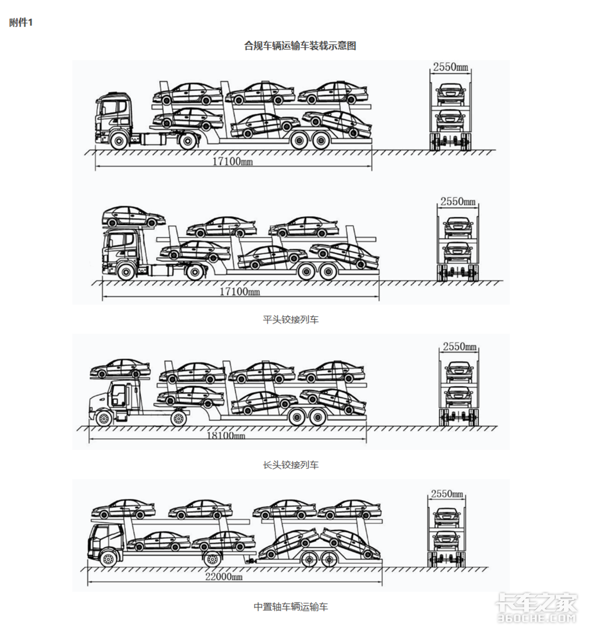 当然,针对于装载乘用车车型较小的也进行了放宽。平头铰接列车装载7辆以上的,严格执行装载长度不得超过17.1米、宽度不得超过2.55米、高度不得超过4米的要求。长头铰接列车装载8辆及以上的,严格执行装载长度不得超过18.1米、宽度不得超过2.55米、高度不得超过4米的要求。中置轴车辆运输车装载9辆以上的,严格执行装载长度不得超过22米、宽度不得超过2.55米、高度不得超过4米的要求。