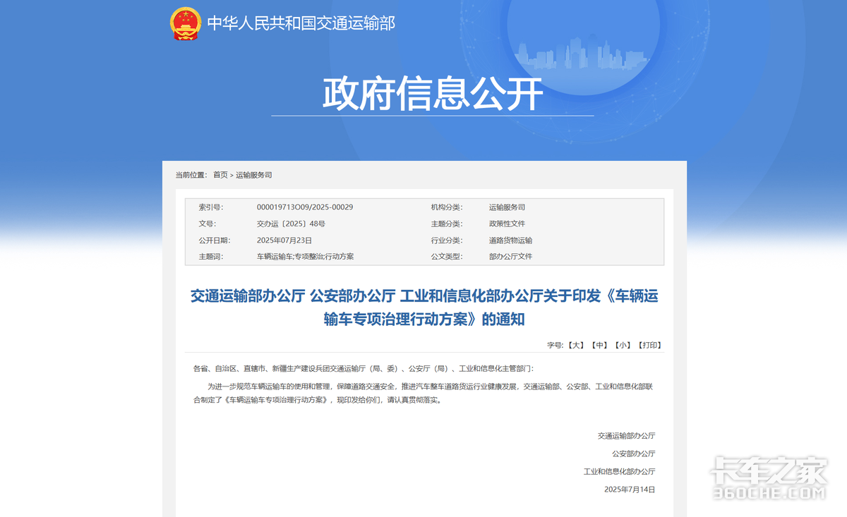 [1]交通运输部办公厅 公安部办公厅 工业和信息化部办公厅关于印发《车辆运输车专项治理行动方案》的通知 2025年07月14日