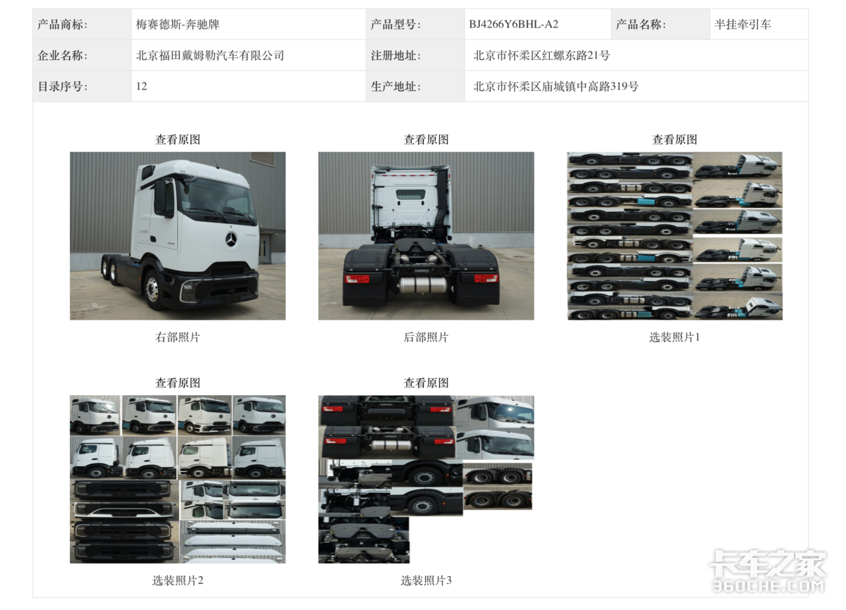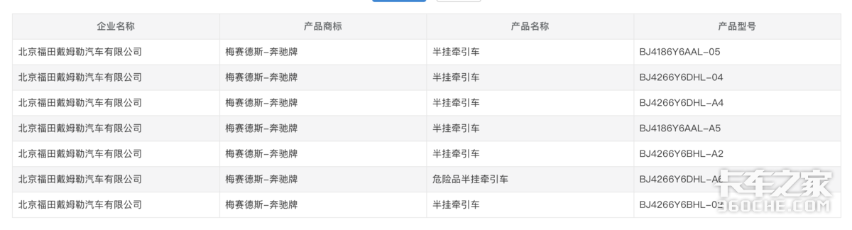 在第398批汽车公告中,福田戴姆勒总共申请了7款梅赛德斯奔驰牵引车公告,其中六款半挂牵引车,一款危化品半挂牵引车,均为柴油动力,涵盖4x2、6x4两种驱动形式。