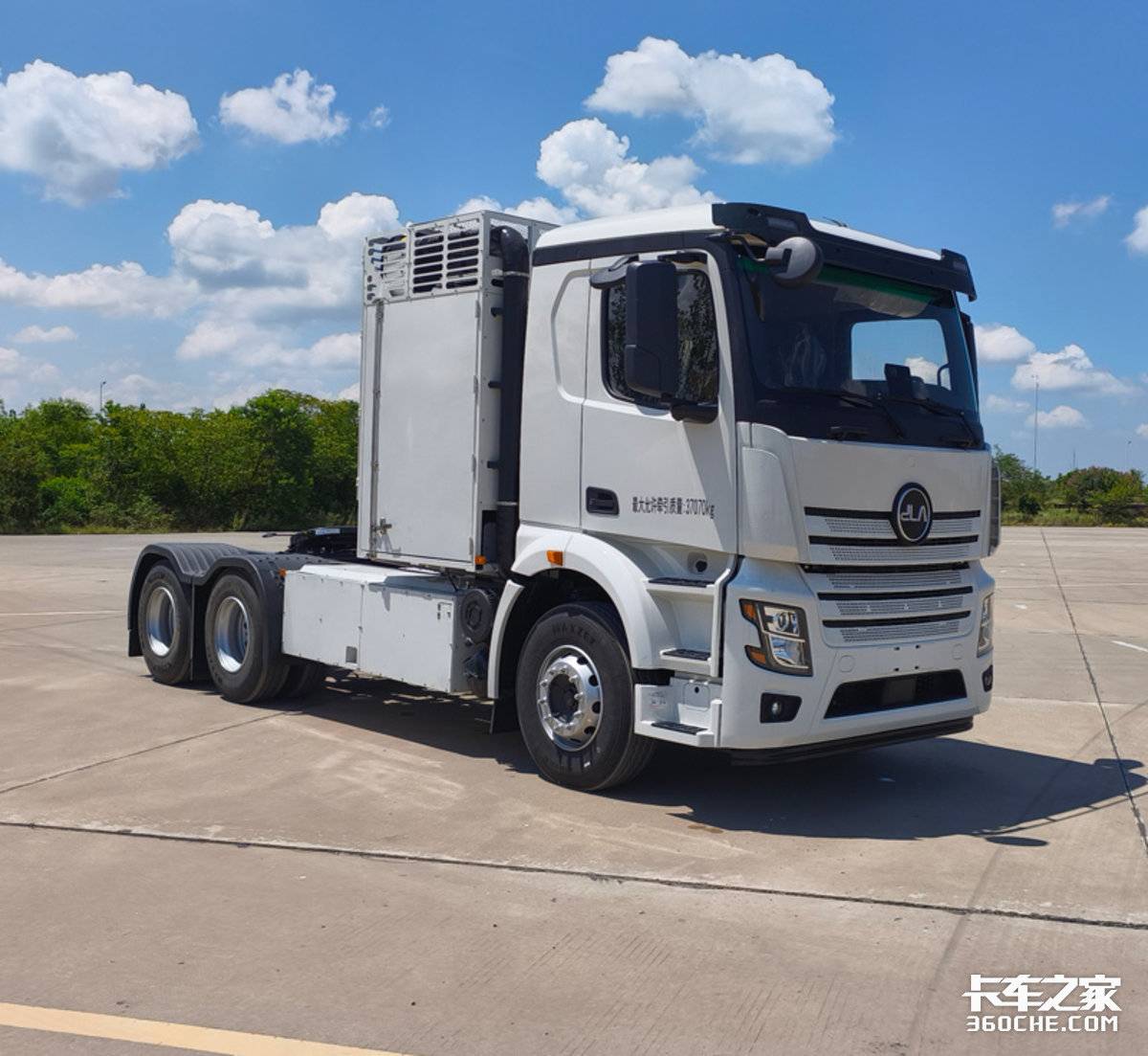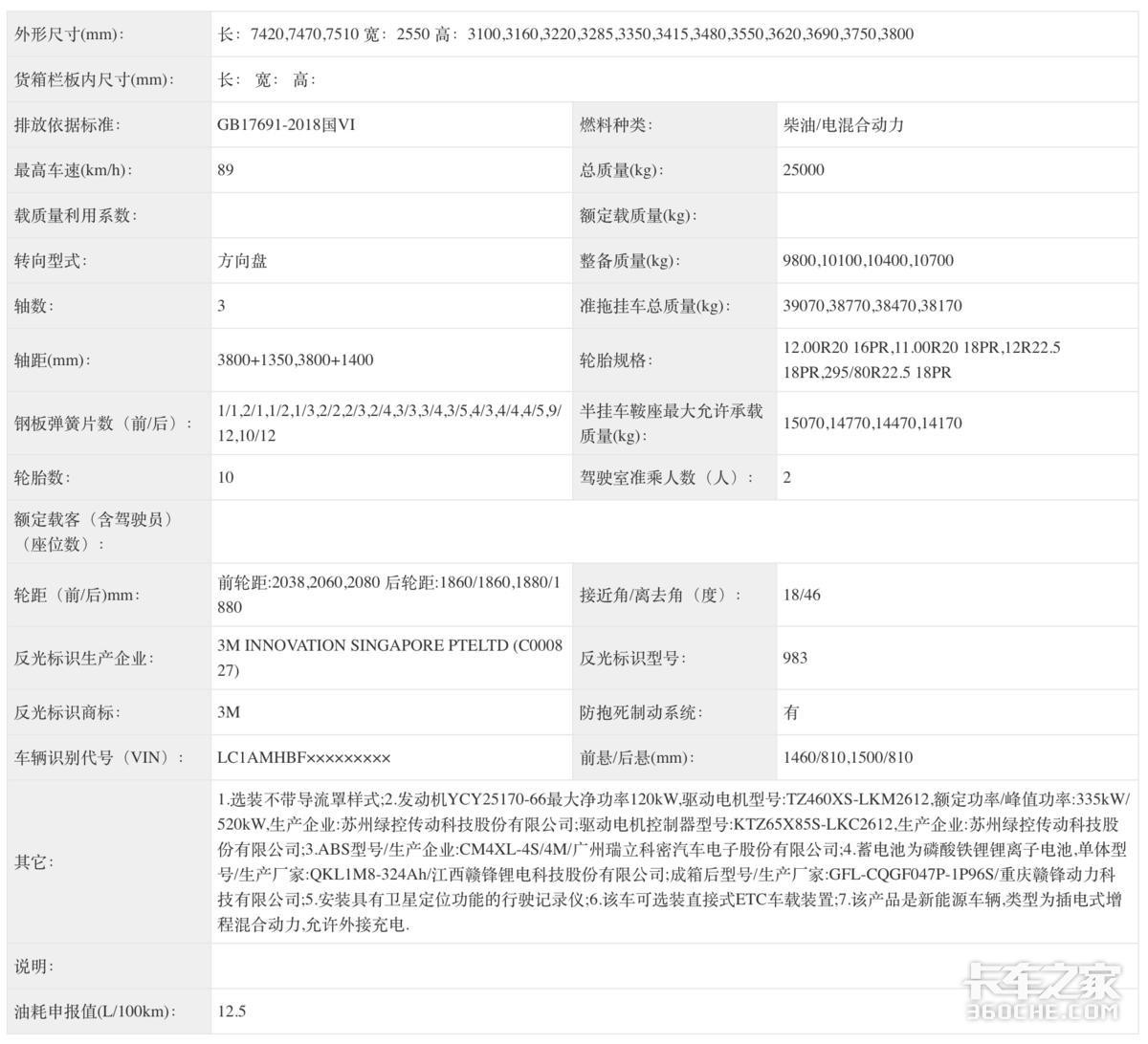 徐工申请的是一款插电式增程混合动力半挂牵引车,柴油/电混合动力,发动机采用的是玉柴YCY25170-66,峰值功率为123kW,驱动电机来自苏州绿控,峰值功率为520kW,储能装置为磷酸铁锂锂离子电池,电芯单体来自江西赣锋锂电,整体产品来自重庆赣锋动力。