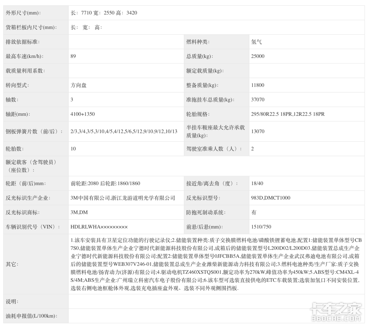 德力新能源申请的是德帅牌燃料电池半挂牵引车公告,轴距为4100+1350mm,储能装置为磷酸铁锂蓄电池,选择比较有意思,总成可选宁德时代以及潍柴新能源的,而后者的电芯则来自于弗迪电池。质子交换膜燃料电池为杨青动力,驱动电机来自湖北普旺,峰值功率为450kW。