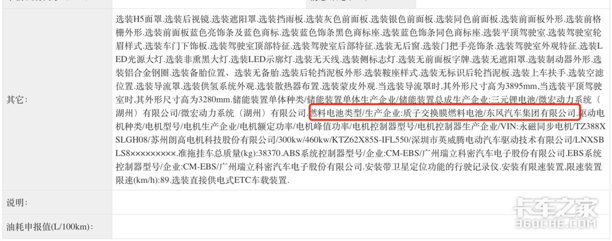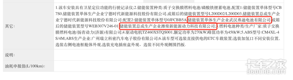 在第398批汽车公告中,东风系申请的乘龙H7燃料电池牵引车公告中,我们可以看到其质子交换膜燃料电池生产企业为东风汽车集团有限公司,在此之前,潍柴系牵引车采用潍柴新能源的动力电池组已经不足为奇,其电芯来自于弗迪电池。