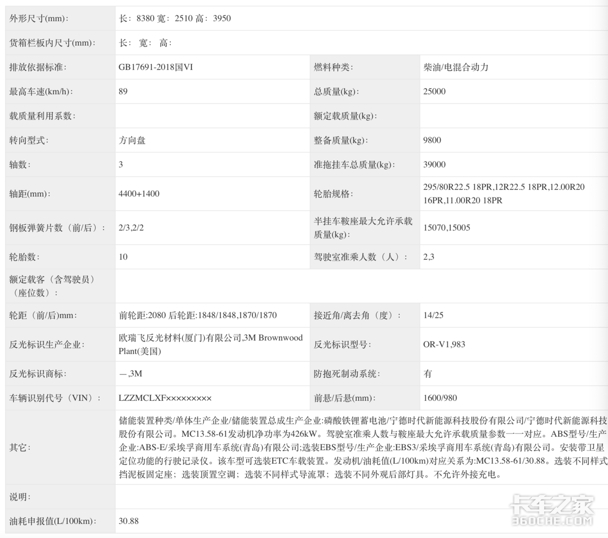 重汽申请的是一款黄河混动牵引车,柴油/电混合动力,整备质量9800kg,发动机采用的是自产MC13.58-61发动机,峰值功率429kW,储能装置为宁德时代的磷酸铁锂电池。