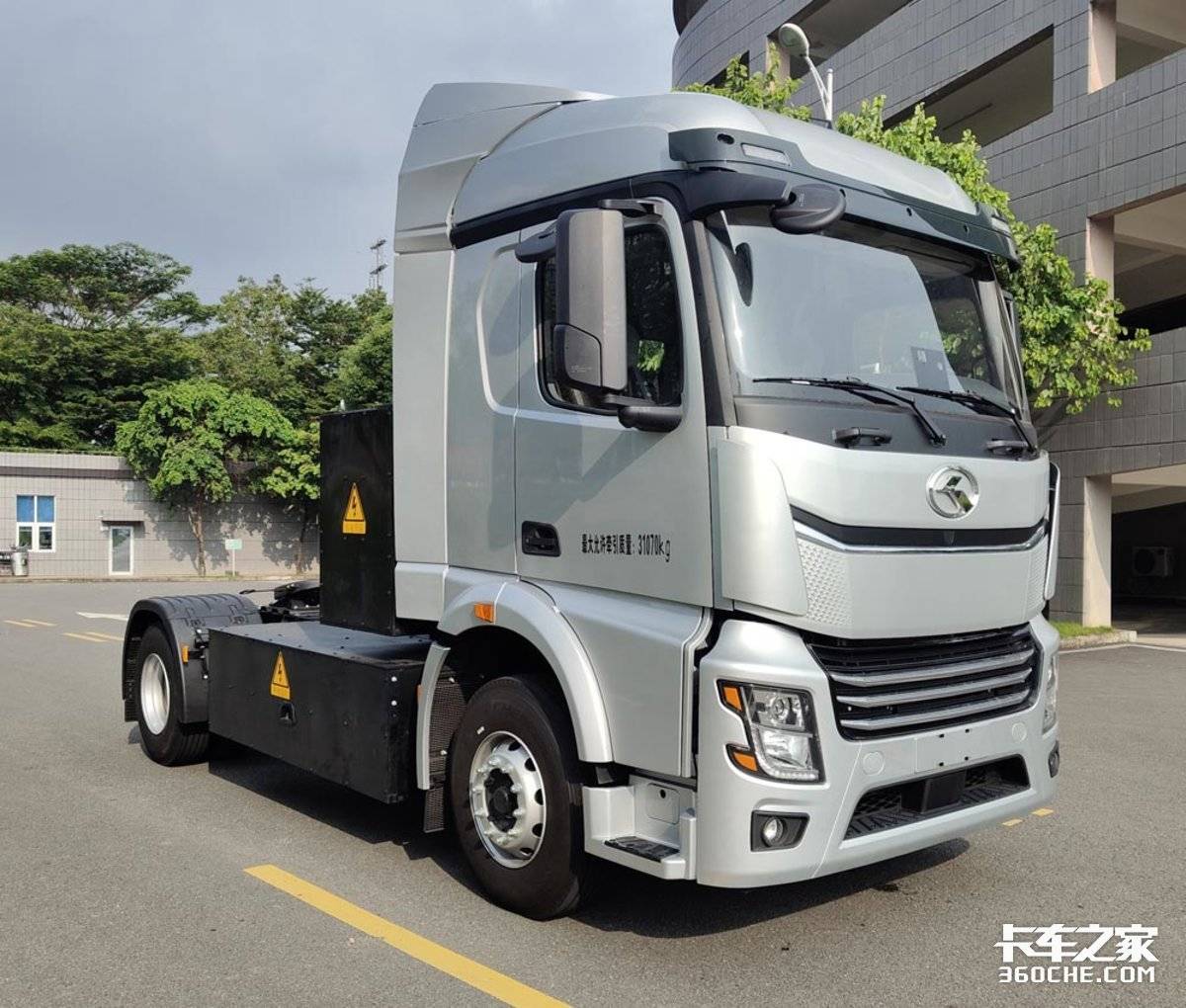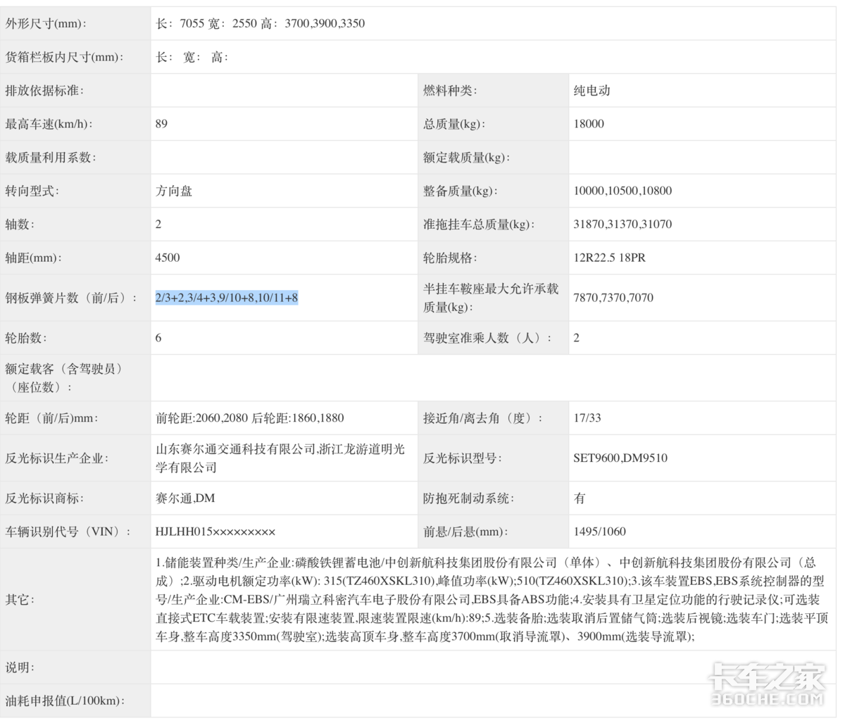 厦门金龙申请的是一款金龙牌4x2纯电动牵引车的公告,轴距为4500mm,电池来自中创新航,采用侧置和后背的布置,驱动电机来自金龙新能源,峰值功率为510kW,整备质量有10000,10500,10800kg三种选择,钢板悬架也有2/3+2,3/4+3,9/10+8,10/11+8多种形式。