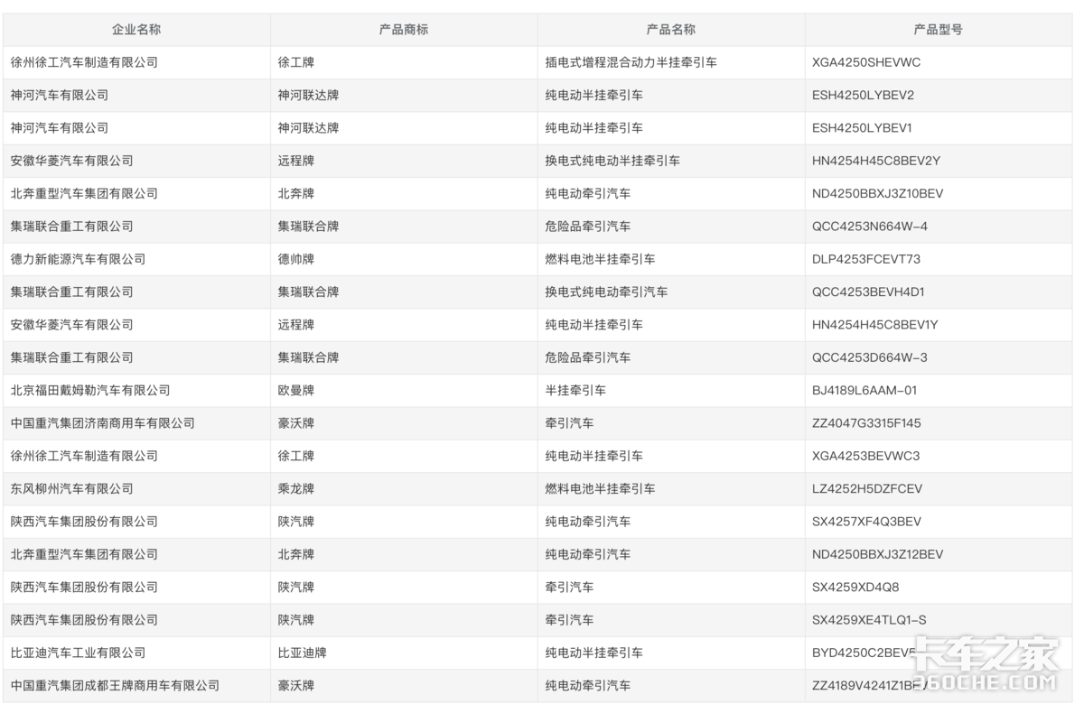 但是面对未来的市场潜力,各大主机厂也都在此战略性“加码”,最近几批汽车公告中,也有不少混动牵引车亮相。此次398批汽车公告中有4款混动牵引车亮相,品牌分别是徐工牌、东风牌、解放牌、黄河牌,其中前三者为插电混动式产品。