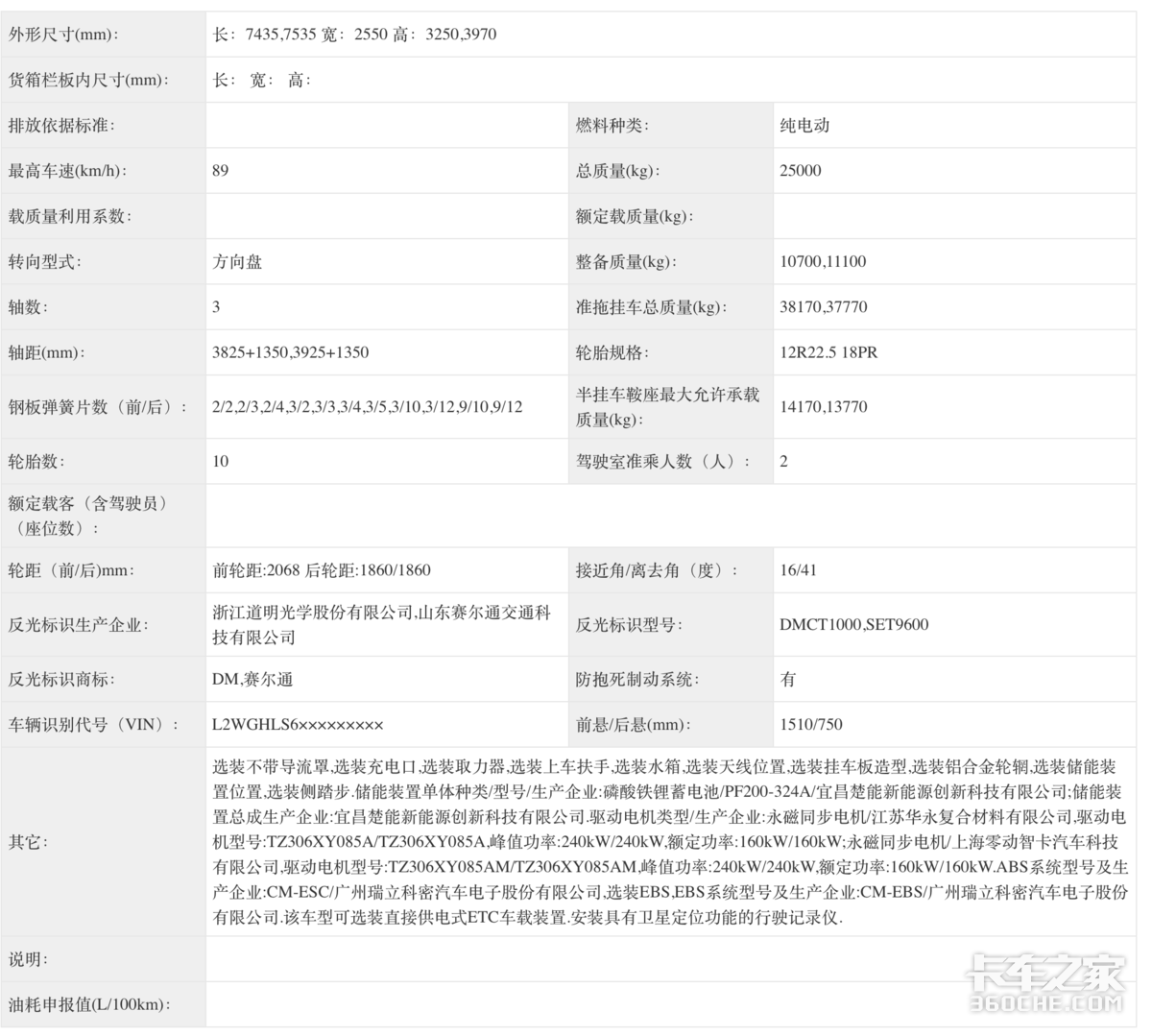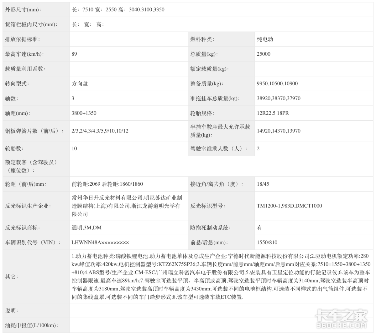 中车时代申请的是一款中国中车牌6x4纯电动牵引车公告,整车轴距为3800+1350mm,电池组采用的是宁德时代的磷酸铁锂电池,后背设计,驱动电机选用的是自家的产品,峰值功率420kW,整备质量有9950,10500,10900kg三种选择。
