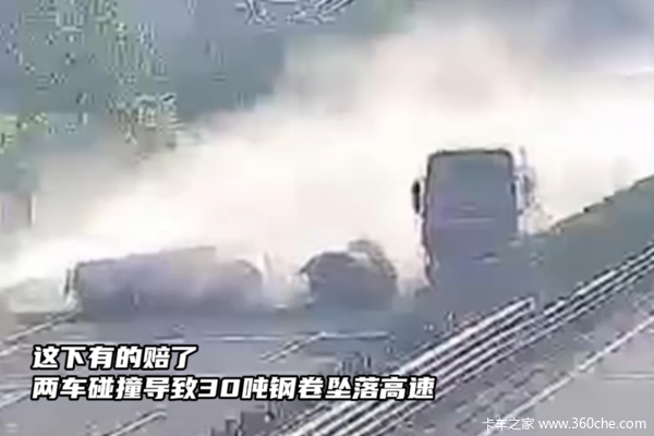 两车碰撞致30吨钢卷掉高速 ,这下有的赔了。