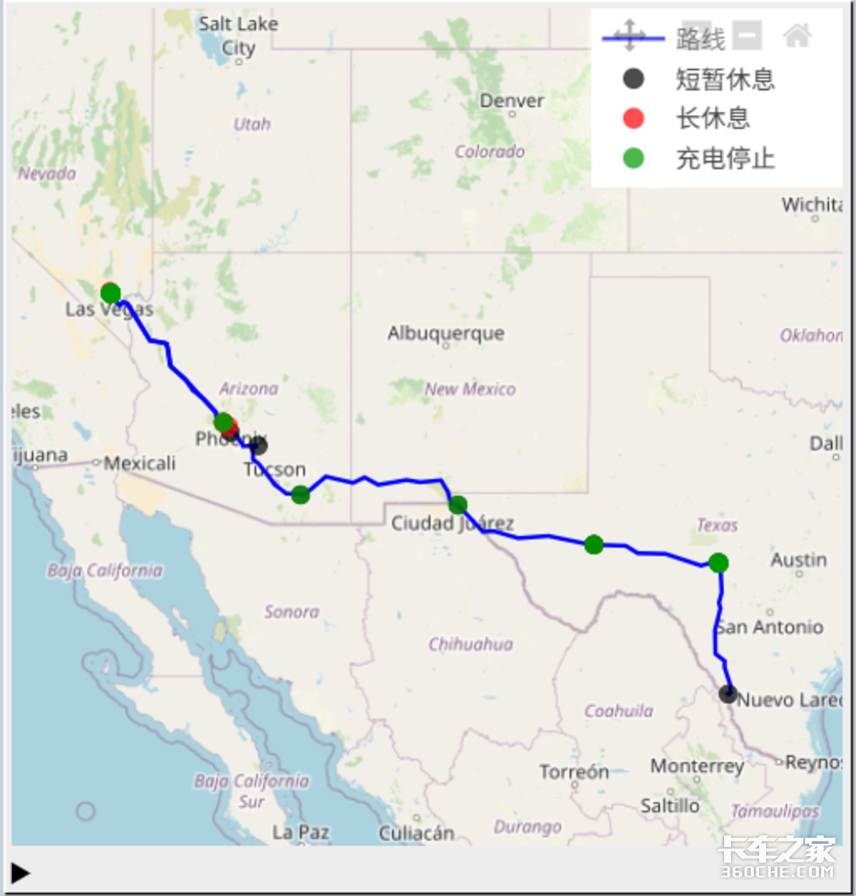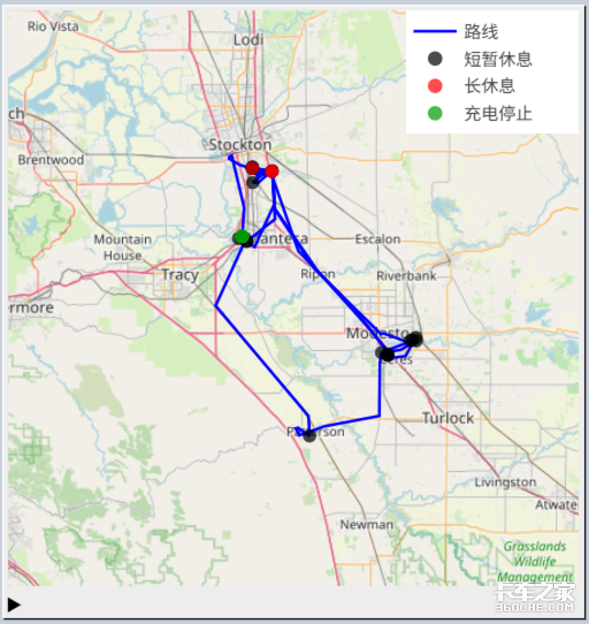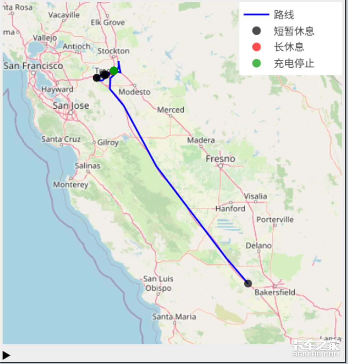 特斯拉Semi 1号(由SAIA运营)18天累计行驶约1690公里,估计交付次数135次,平均每次交付行驶12.52公里。结合其短里程但高交付次数的特性以及行驶轨迹,典型地指向了“倒短/城际短途+频繁停靠”的工况。