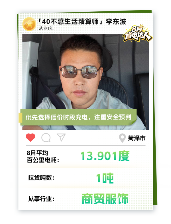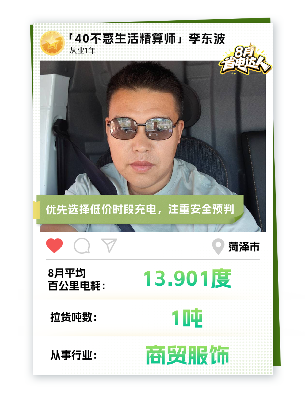 对于东风睿立达这个"好伙伴",李师傅恐怕有一肚子话要说,"外观上档次,性能好""空间设计合理,甚至副驾都可放平供人休息""皮实、抗造""车型对于货运更有优势,在平台都很容易接单"......但最让他满意的,还是算来算去最划算的"经济账"!"这车非常省电,同时充电也很快速"。当问到李师傅有什么"省电秘诀"时,他则是谦虚地说着"平常随需充电,优先选择低价时段充电;通常剩余20%电量时充电""没有刻意省电,但是比较注重安全预判,比如提前松油门减速;也要避免超载,重载时很容易电耗高并且刹车安全性容易下降......"明明是"省电达人老司机",但是李师傅依然很谦虚地和大家分享着自己的省电技巧!