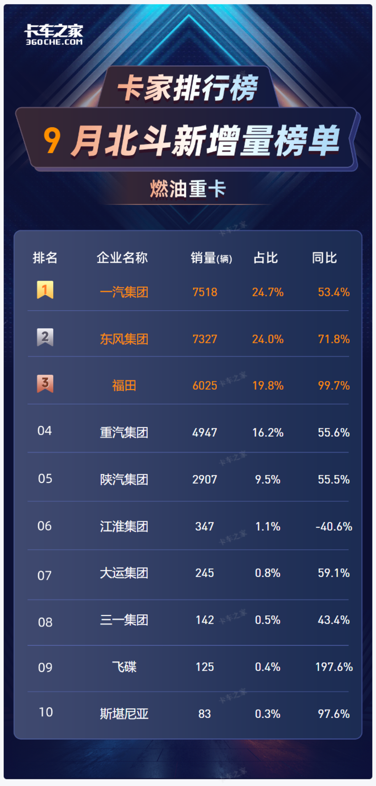 9月销量差不到200台,解放与东风的“龙争虎斗”愈发激烈。