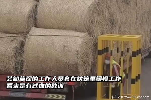 装卸草垛的工作人员套在铁笼里缓慢工作 看来是有过血的教训