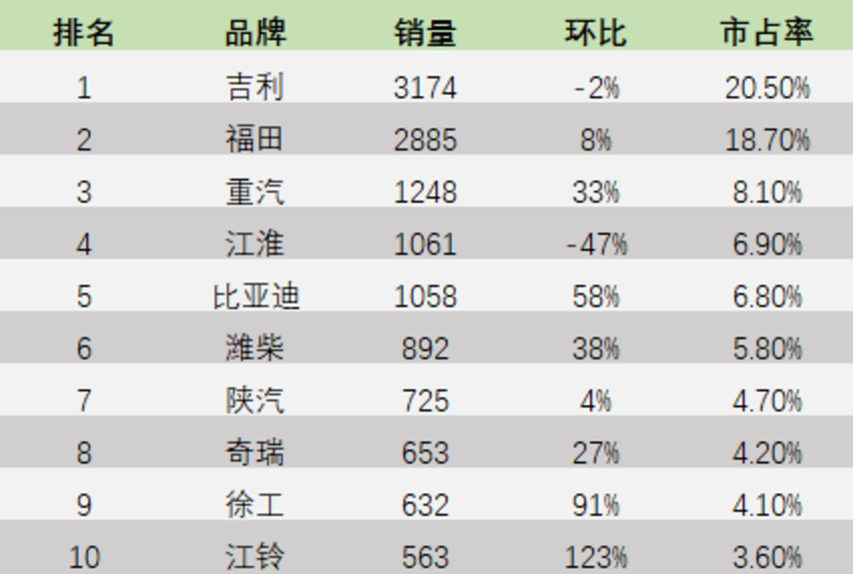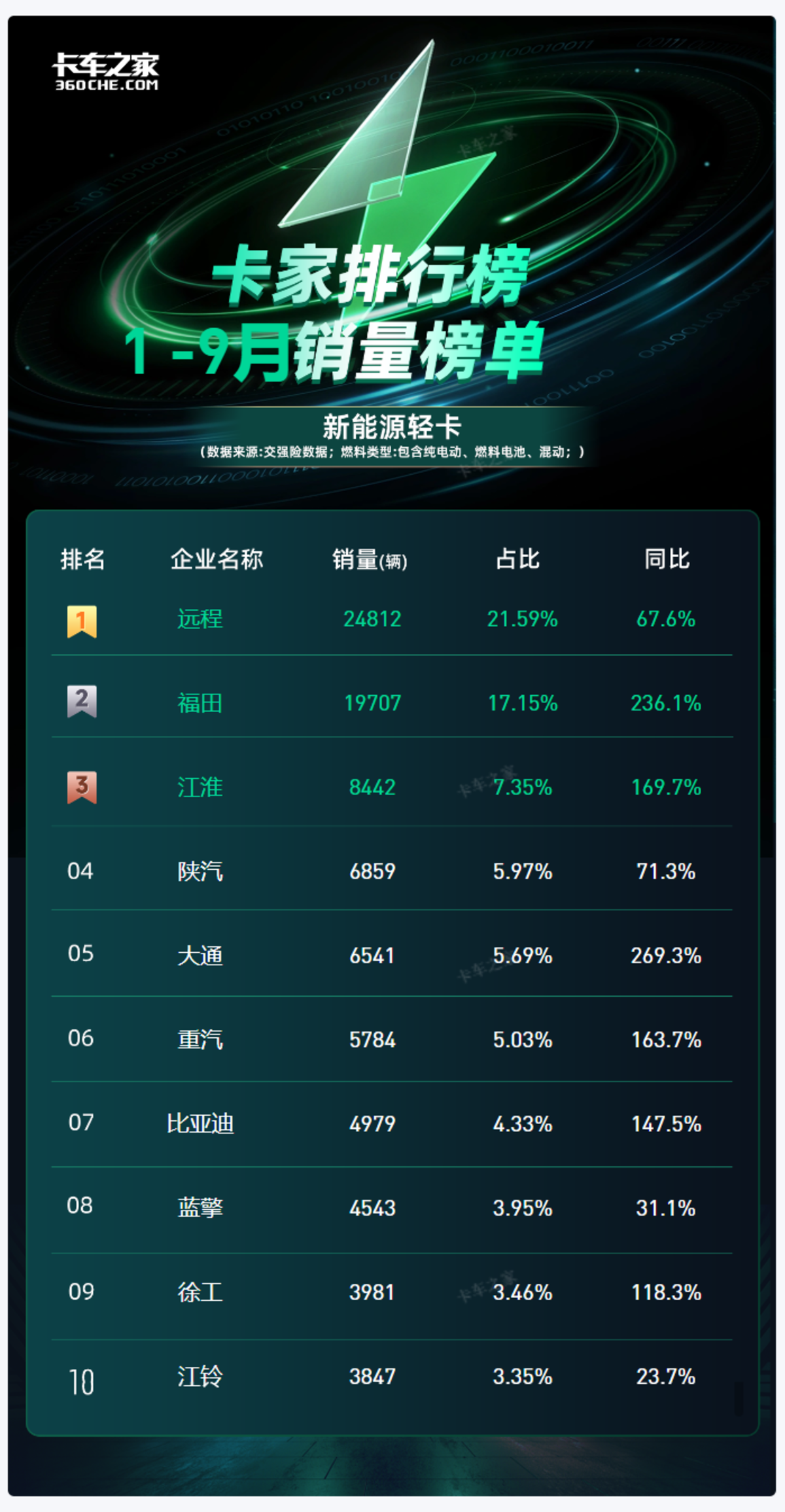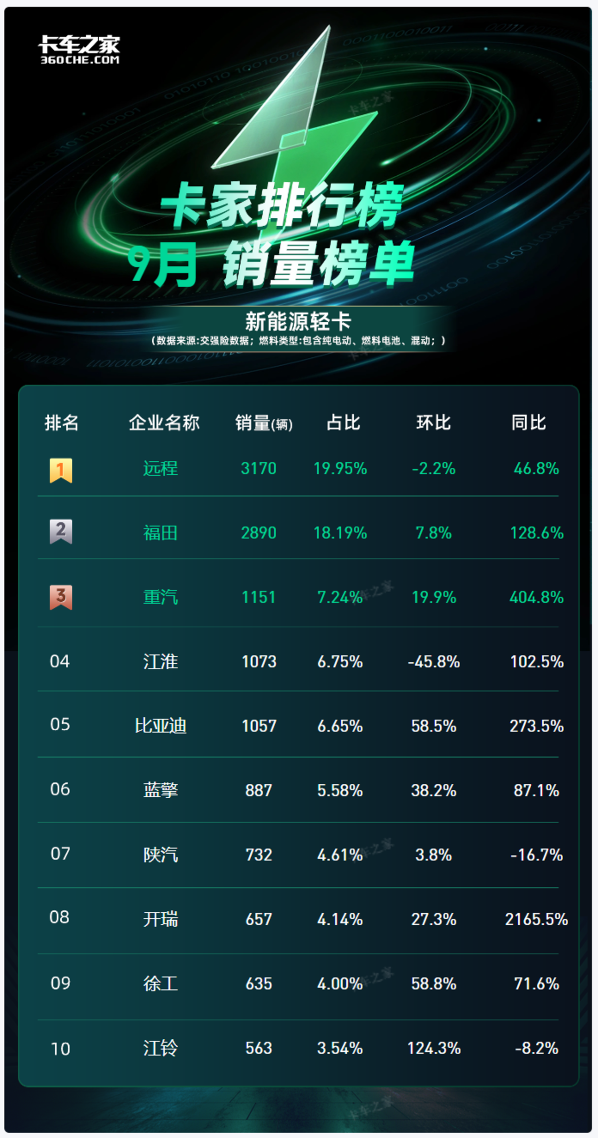 205年9月,最新新能源轻卡上险数据出炉,在排名前十的排行榜中,排名前三的分别是远程、福田以及重汽。