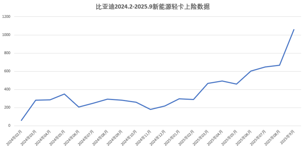 而我们从2024年2月到2025年9月比亚迪新能源轻卡上险数据总结来看,比亚迪新能源轻卡销量一直稳步增长。其中,在2025年2月到3月有一个增速高峰,在2025年8月到9月增速更加显著。按照如此趋势下去,下一波新高峰将会出现在年底。