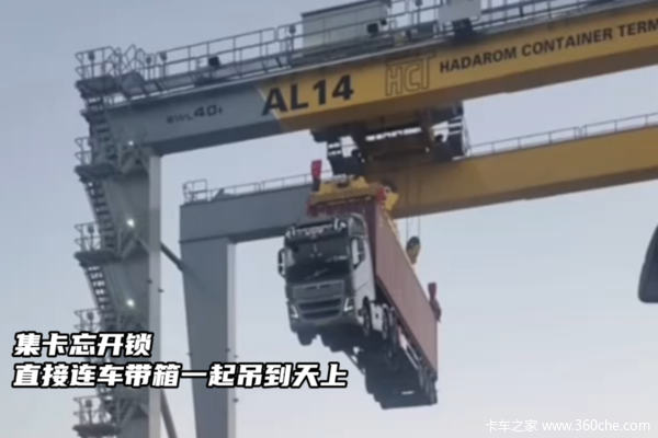 集卡忘开锁,直接连车带箱一起吊到天上。
