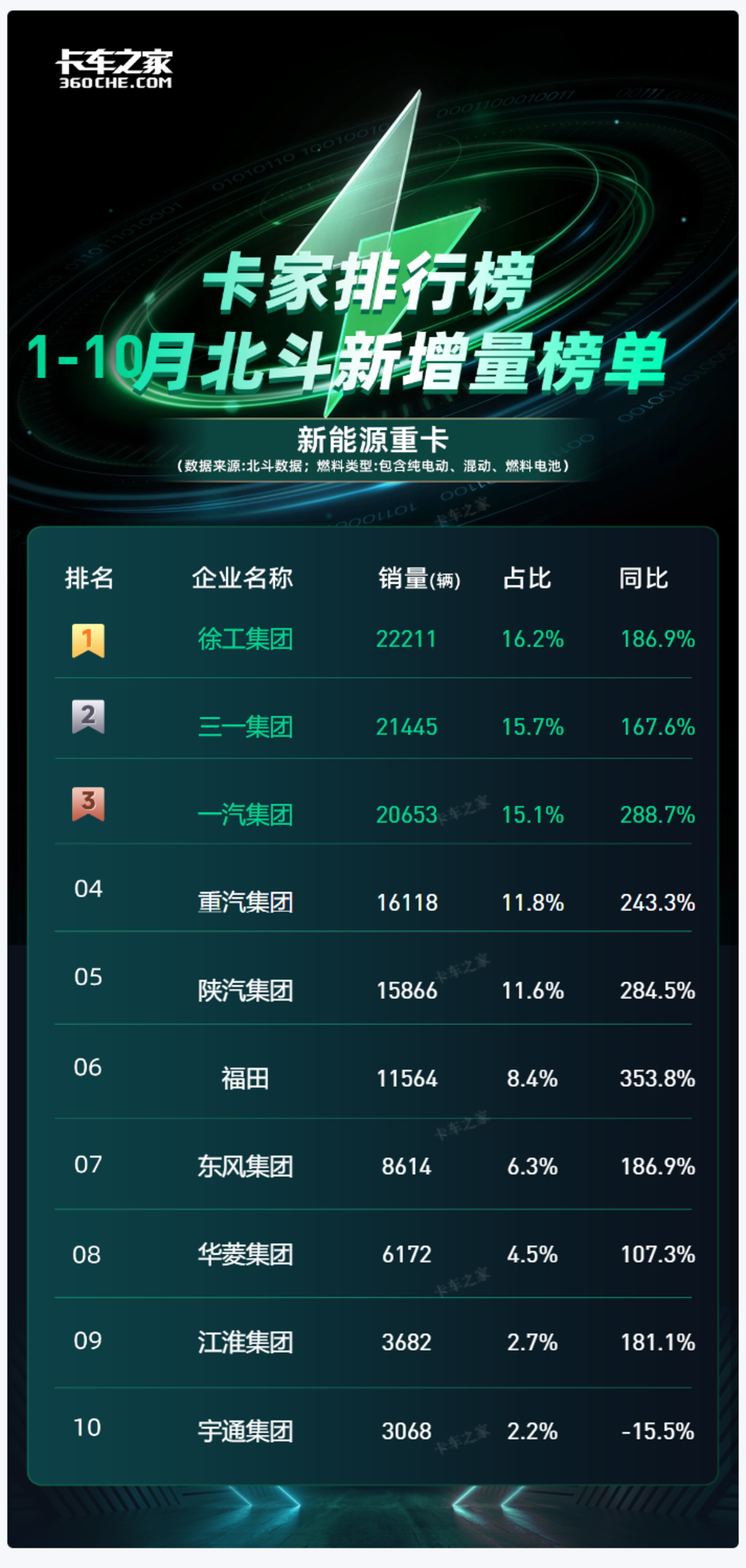 1-10月,徐工总销量22211台,同比增长186.9%;三一总销量21445台,同比增长167.6%;解放总销量20653台,同比暴涨288.7%。三家第一梯队优势明显,在新能源重卡市场的竞争赛中,可谓是平分秋色。