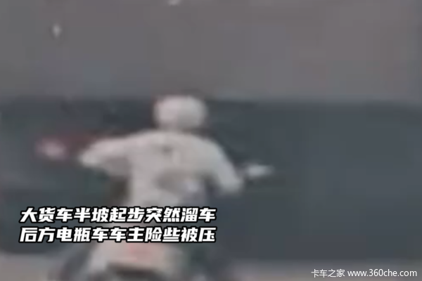 大货车半坡起步突然溜车,后方电瓶车车主险些被压。