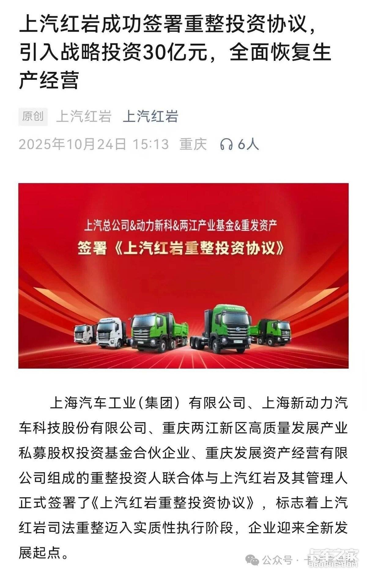 2025年9月30日,重整方案落地:由上汽总公司、重庆地方国资等四方组成的联合体,出资30亿元,获得重整后上汽红岩66% 的股权。