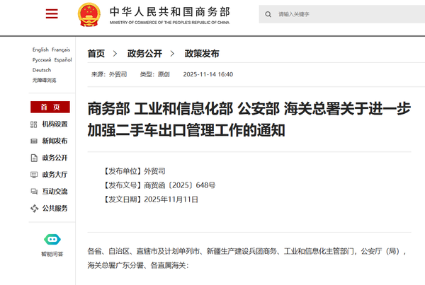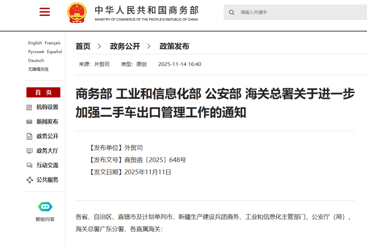 2025年11月14日,商务部、工业和信息化部、公安部、海关总署联合发布《关于进一步加强二手车出口管理工作的通知》,以一系列精准监管举措剑指长期困扰行业的“新车以二手车名义出口” 乱象。这一政策的出台,标志着我国二手车出口行业将告别野蛮生长的规模扩张时代,正式迈入以规范为基、以价值为核的高质量发展新阶段。